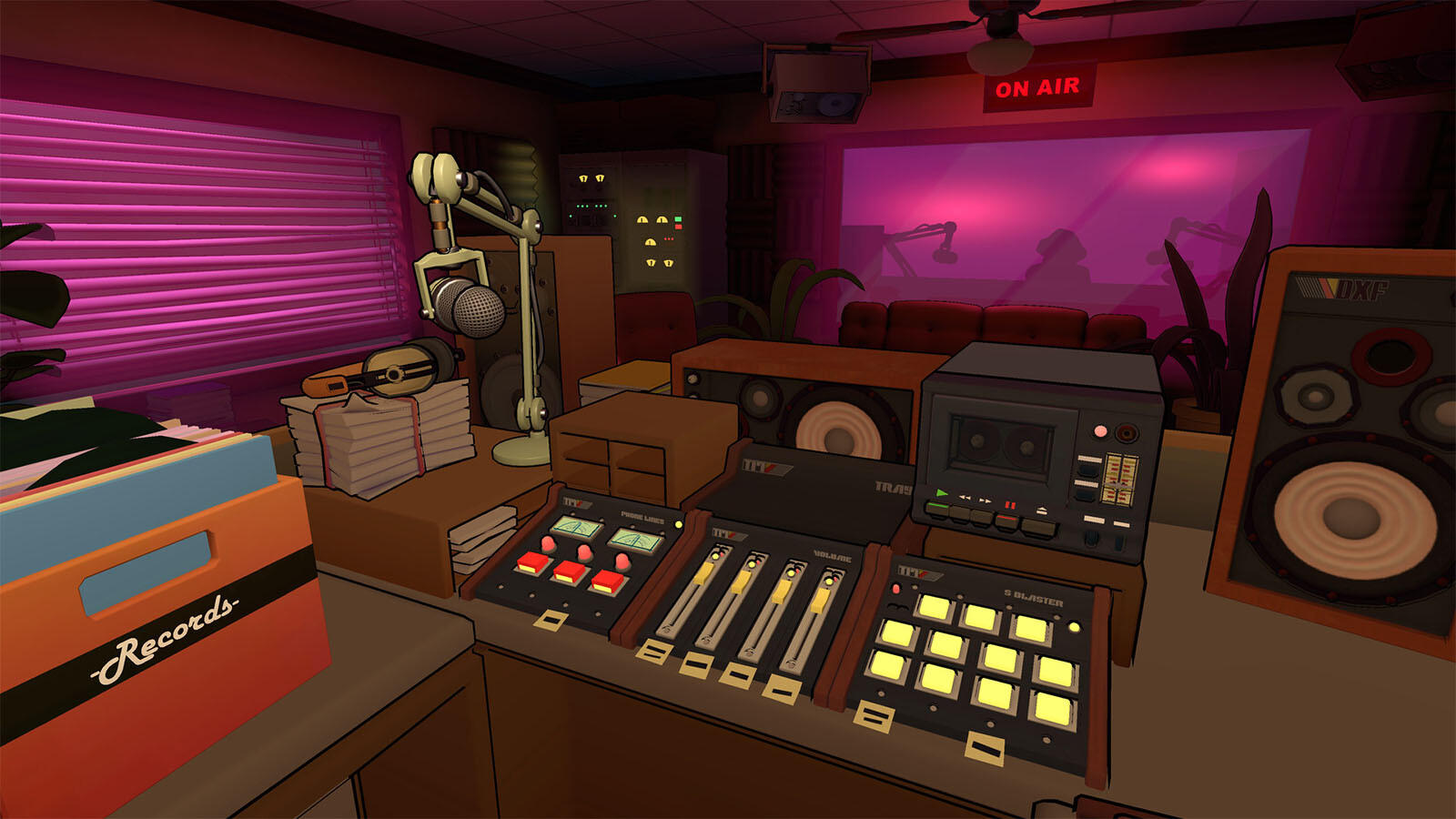 Explore over 1 km² of an authentically detailed radio station and interact with dozens of physics-based objects straight from a bygone era, including a working cassette and record player.